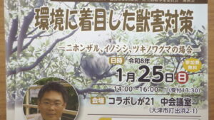 獣医師会の野生動物事業で開催される、無料の講演会のお知らせです。 タイトル:環境に着目した獣害対策~ニホンザル、イノシシ、ツキノワグマ~ 日時:1月25日(日曜) 14時~16時場所:大津市 コラボしが21 中会議室 講 […]